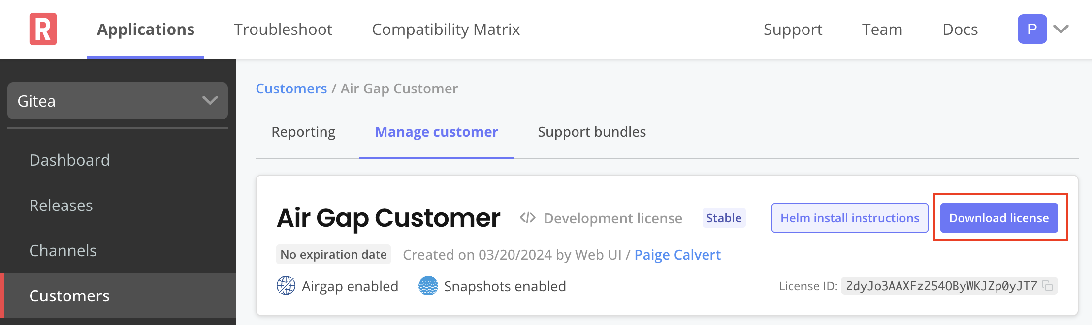 For information about how to download customer licenses with the Vendor API v3, see Download a customer license file as YAML in the Vendor API v3 documentation.